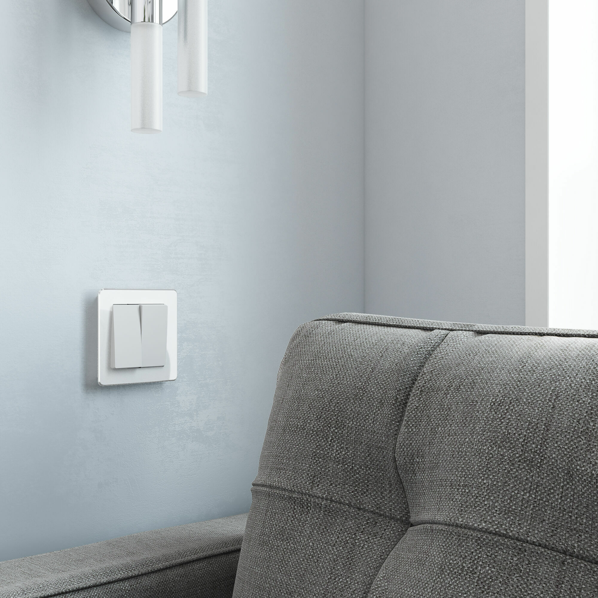 Механизм двухклавишного проходного выключателя оснащен матовой лицевой панелью. Матовая поверхность – это современный тренд, задающий стиль вашему интерьеру. Она не бликует, обладает бархатистой фактурой и тактильной мягкостью. Белый цвет будет эффектно смотреться в любом интерьерном пространстве и гармонично сочетаться с любыми материалами.