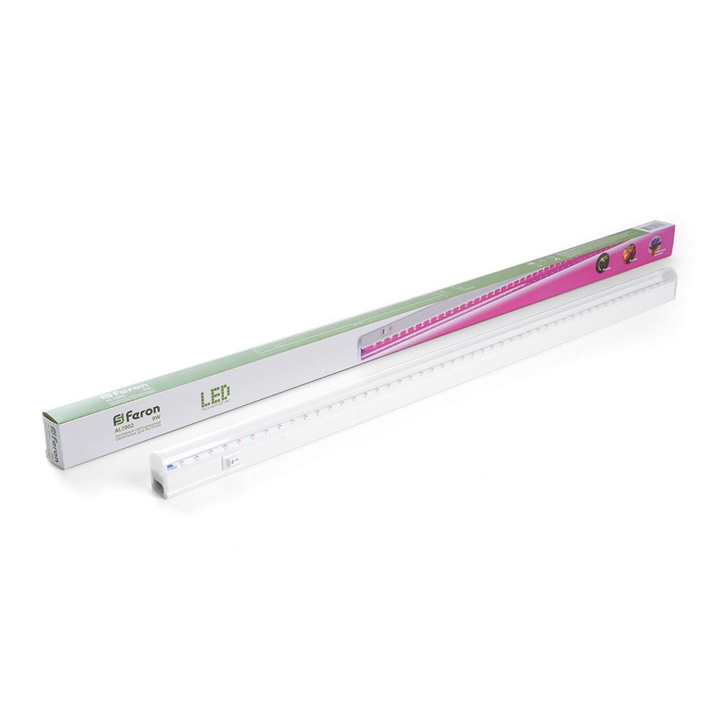 Светильник линейный светодиодный, для растений (ДББ) FERON AL7001, 9W, спектр фотосинтез (красно-синий), 230V, 360Lm, IP40, цвет белый, корпус пластик, рассеиватель пластик, 573*20*31 мм