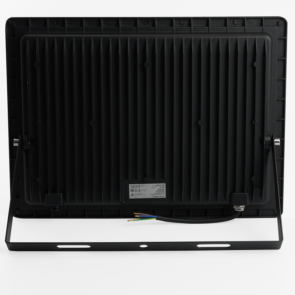 Прожектор светодиодный многоматричный с монтажным креплением на кронштейн, (ДО) SAFFIT SFL90-200, 200W, 6400К (дневной), 230V/50Гц, 18000Lm, IP65, угол рассеивания 120°,*SMD2835, раб.t -40°C - +40°C, цвет черный, корпус алюминий литой под давлением + стекло, 377,5*277*31,3 мм