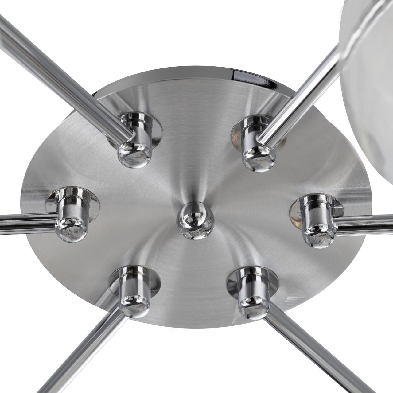 Потолочные светильники серии «Буги» выделяется интересным дизайном в стиле модерн. Люстры сделаны из легкого метала и интересными стеклянными двойными плафонами. Внешняя сторона плафона прозрачная с дизайнерским узором, а внутренняя полупрозрачная. За счёт полупрозрачного плафона свет в помещении получается очень яркий, равномерно рассеянный, но вместе с тем мягкий, приятный для зрения. Арматура модели на шесть рожков с завода в упаковке собрана и скоммутирована на двойной выключатель. Деление осуществлено 4х2, с одной клавиши будет включаться четыре плафона, со второй ещё два. Подключение произведено через один плафон. Люстры производятся в двух цветах: белый плюс хром, идеальное решение для нежных и светлых интерьеров, и алюминий плюс хром, который лучше сочетается с современными дизайнами. Арматура слегка вытянута, не идеальный круг. Такое конструктивное решение позволяет достигать хороших показателей освещённости по углам комнаты. Крепятся люстры под потолком тем самым они не занимают место и прекрасно подходят к помещениям с небольшой высотой потолка. Патроны выполнены из термостойких материалов, выдерживают лампы накаливания до 75 ватт включительно, а энергосберегающие, или светодиодные лампы можно использовать любой яркости, что позволит вам осветить большие площади. Площадь освещения моделей на четыре рожка до 21 квадратного метра.
