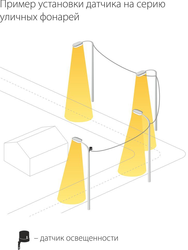 Датчик освещенности крепится на монтажной поверхности в районе использования. Подключается к сети 230 В. Использование устройства позволяет не беспокоиться о включении и выключении подсветки при наступлении темноты или светлого времени суток.