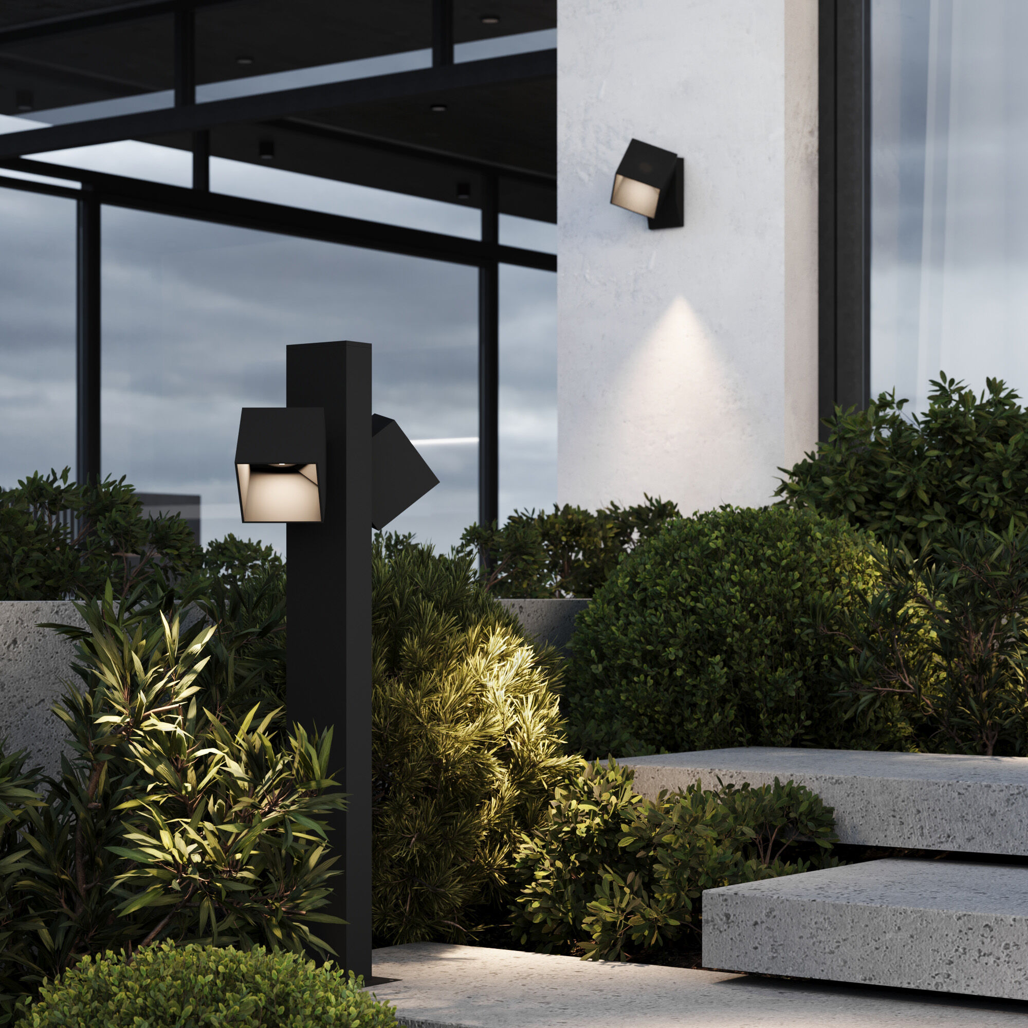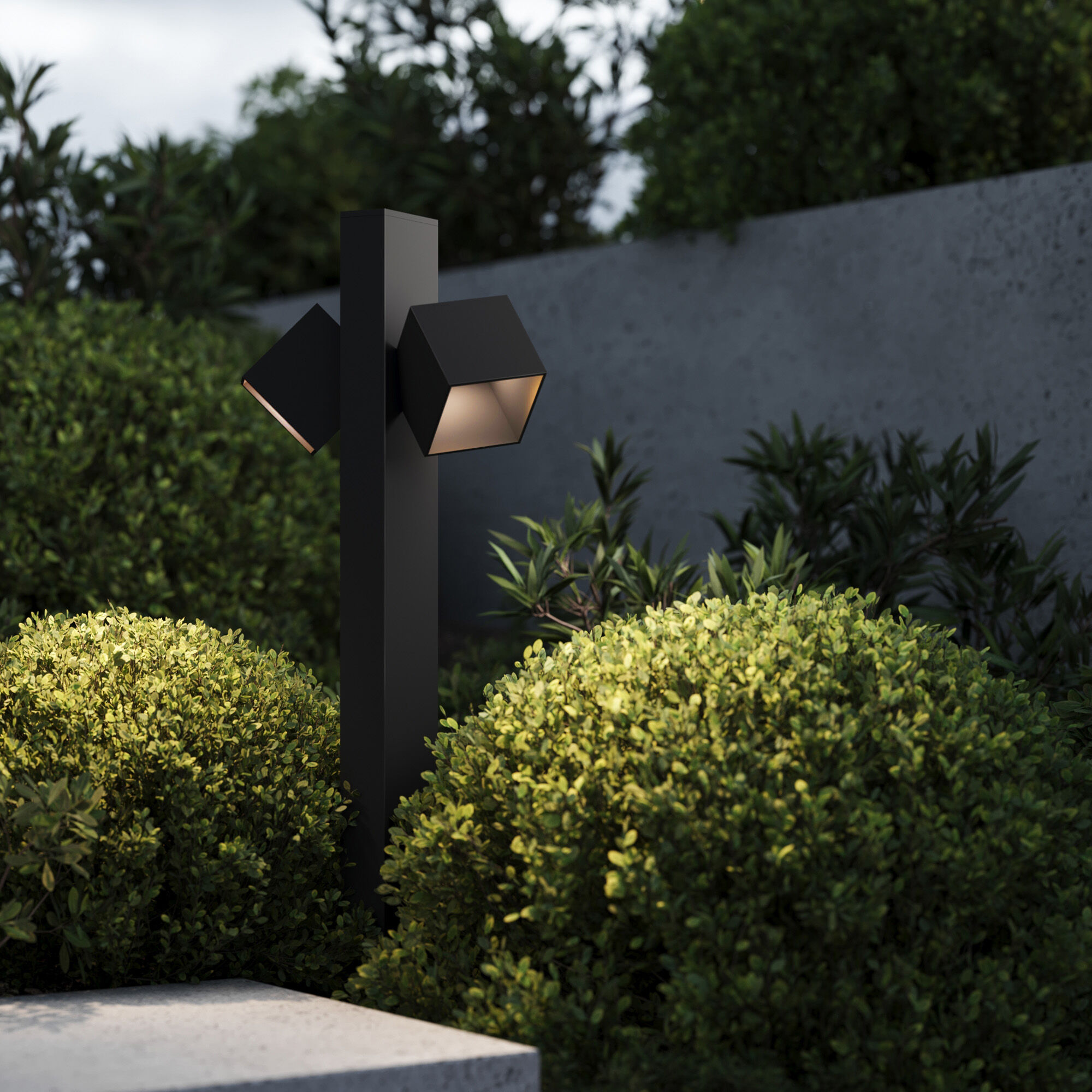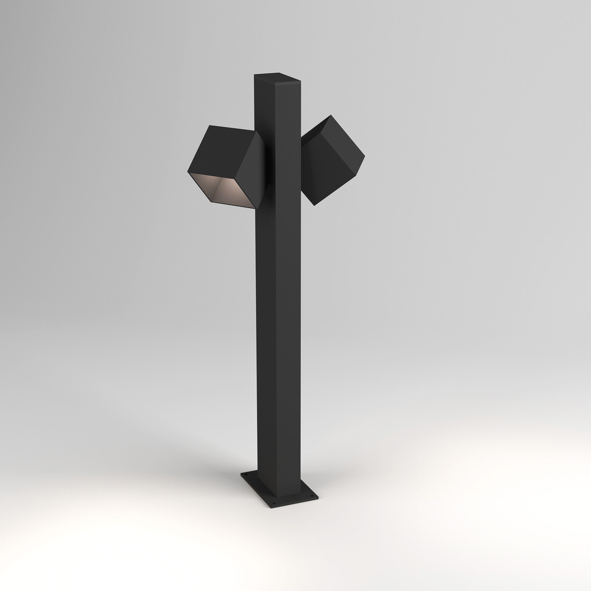 Кубические плафоны, которые можно повернуть в нужное направление, формируют свет в разные стороны, обеспечивая равномерное освещение территории в темное время суток. Светильник соответствует степени IP65, что гарантирует его устойчивость к воздействию окружающей среды. Модель проста в установке, в комплекте имеется гермоввод для надежной защиты при подключении к сети.